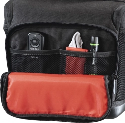 Het voorvak met rits, de zijvakken van mesh en de verstelbare binnenverdeler houden alles overzichtelijk – van kabels en kaarten tot batterijen.