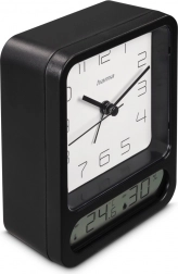 Deze stijlvolle wekker combineert een klassiek uiterlijk met moderne functionaliteit. De grote analoge wijzerplaat met contrasterend wit vlak en Arabische cijfers biedt uitstekende leesbaarheid, terwijl het onderste digitale display continu de temperatuur en luchtvochtigheid binnenshuis weergeeft. Zo heb je een praktische thuisweerstationsfunctie en een betrouwbare tijdsaanduiding in één.