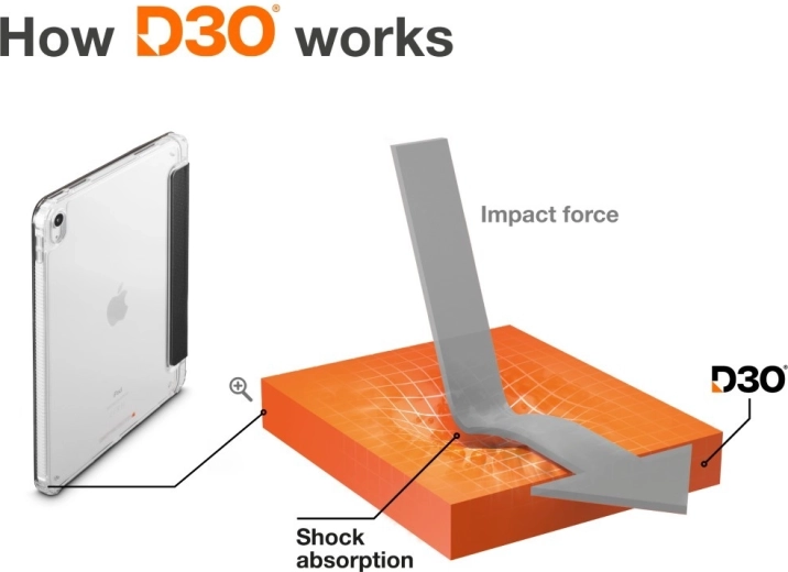 De gelicentieerde D3O-technologie absorbeert schokken en helpt de iPad te beschermen bij valpartijen. Verhoogde randen beschermen bovendien zowel de camera als het display tegen schade.
