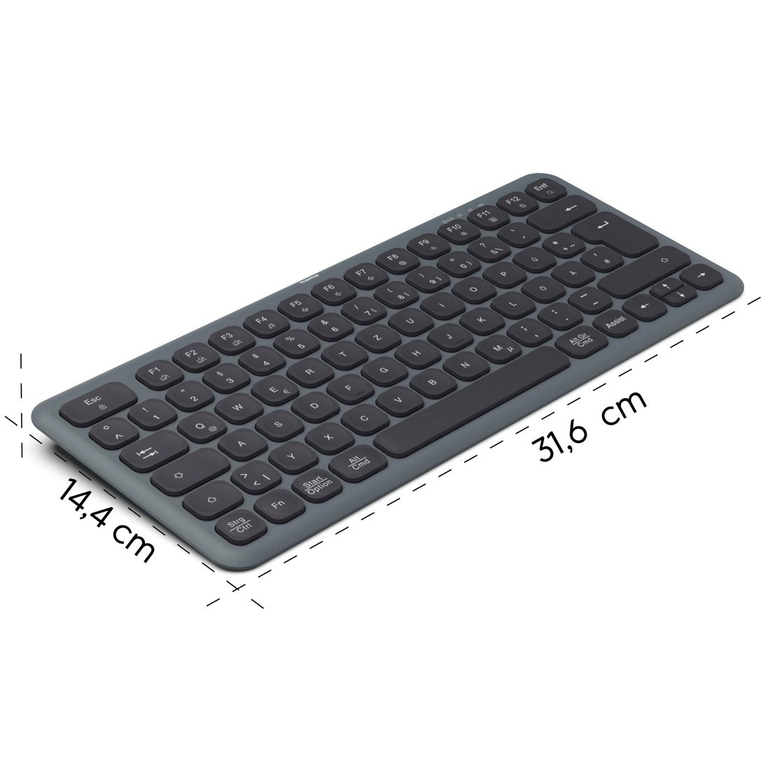 Het draadloos toetsenbord Hama WK-500 combineert functionaliteit met esthetiek en maakt eenvoudige aansluiting op meerdere apparaten mogelijk. Het ondersteunt gelijktijdige verbinding met één USB en twee Bluetooth-apparaten met snel schakelen via één knop. Stabiele verbinding is gegarandeerd door 2,4 GHz en Bluetooth 5.2 technologie voor een gebruiksbereik tot 10 meter.