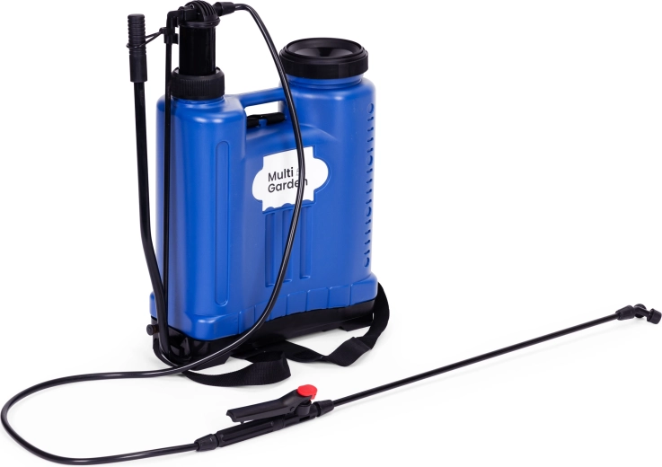 Praktische rugspuit met een inhoud van 16 l van MULTIGARDEN voor tuinonderhoud en huishoudelijke reiniging. Biedt druk 2–4 bar, een lange lans, 4 verwisselbare sproeikoppen, een brede vulopening met filter en een vergrendelbare trekker voor ononderbroken sproeien. Dankzij de verstelbare schouderriemen draag je hem comfortabel als een rugzak.