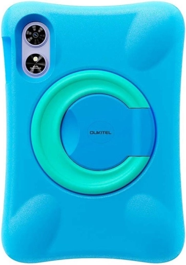 De standaard en het handvat zorgen ervoor dat de tablet gemakkelijk vast te houden en stabiel is. De hoes beschermt het apparaat tegen schokken en is gemaakt van kunststof in de levendige kleuren blauw en turkoois. Op het handvat is het merklLogo 'OUKITEL' zichtbaar.