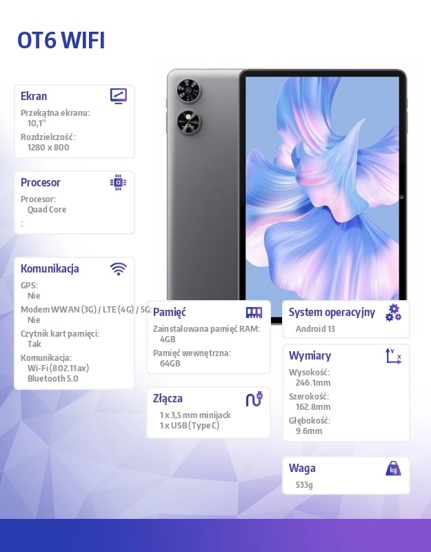Daarnaast biedt hij 64 GB interne opslag met de mogelijkheid tot uitbreiding via een microSD‑kaart, zodat je voldoende ruimte hebt voor al je apps en bestanden. Voor fotografie en videogesprekken is de tablet uitgerust met een 5MP achtercamera en een 2MP frontcamera. Met de 8000 mAh‑batterij geniet je van een lange gebruiksduur, ideaal voor het bekijken van lange video’s en het beluisteren van muziek.