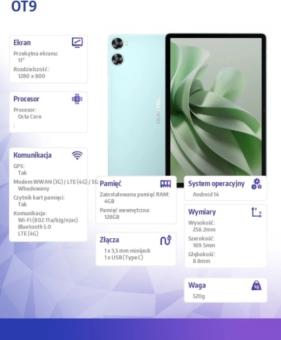 De tablet draait op Android 14 en biedt connectiviteit via Wi‑Fi 802.11 a/b/g/n/ac en Bluetooth 5.0 voor een snelle en stabiele verbinding. Met afmetingen van 259 x 170,6 x 8,7 mm en een gewicht van 524 g is hij bovendien licht en gemakkelijk mee te nemen.