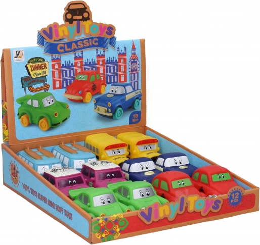 Lichtgewicht autootje van zacht plastic met een lengte van 9 cm en vrijlopende wielen. Keuze uit 6 varianten: Kever, Trabant, sportwagen, Mini, bus, bestelwagen. Ook verkrijgbaar als displaydoos (12 stuks).