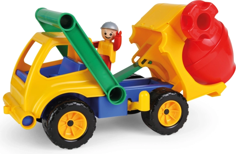 De cementmolen van hoogwaardig, duurzaam kunststof is geschikt om mee te spelen thuis en buiten in de zandbak. Hij heeft een vergrendeling tegen ongewenst kantelen en een openklapbare cabine met een actieve poppetje.