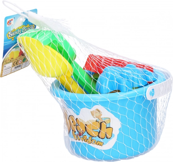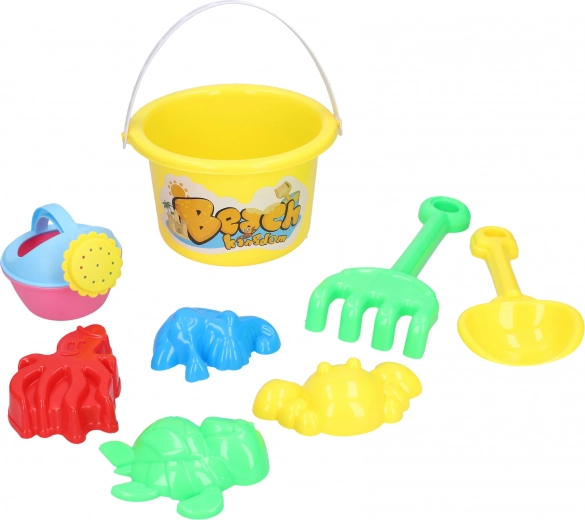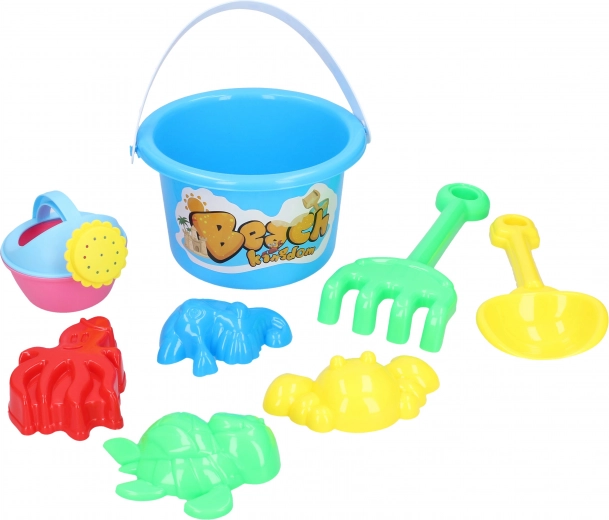- 8 onderdelen in de set: emmer met afbeelding, schep, gieter, harkje en 4 vormpjes