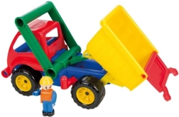De laadbak heeft een praktische vergrendeling tegen spontaan kippen en de cabine kan eenvoudig worden opengeklapt – binnenin wacht een actief figuurtje dat klaar is voor het werk. Het speelgoed ontwikkelt fijne motoriek, coördinatie en rollenspel.