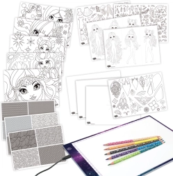 - Tablet, USB-kabel, 5x dubbelzijdig kleurpotlood, 1x zwarte stift, inspirerende vellen