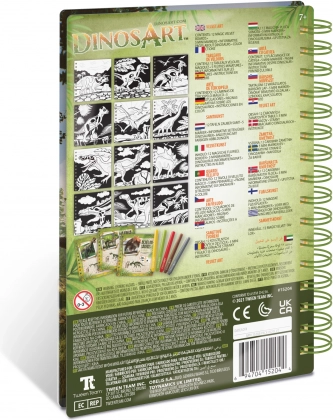 - 12 fluwelen kleurplaten, 5 mini stiften, instructies, informatieve pagina’s over dinosaurussen