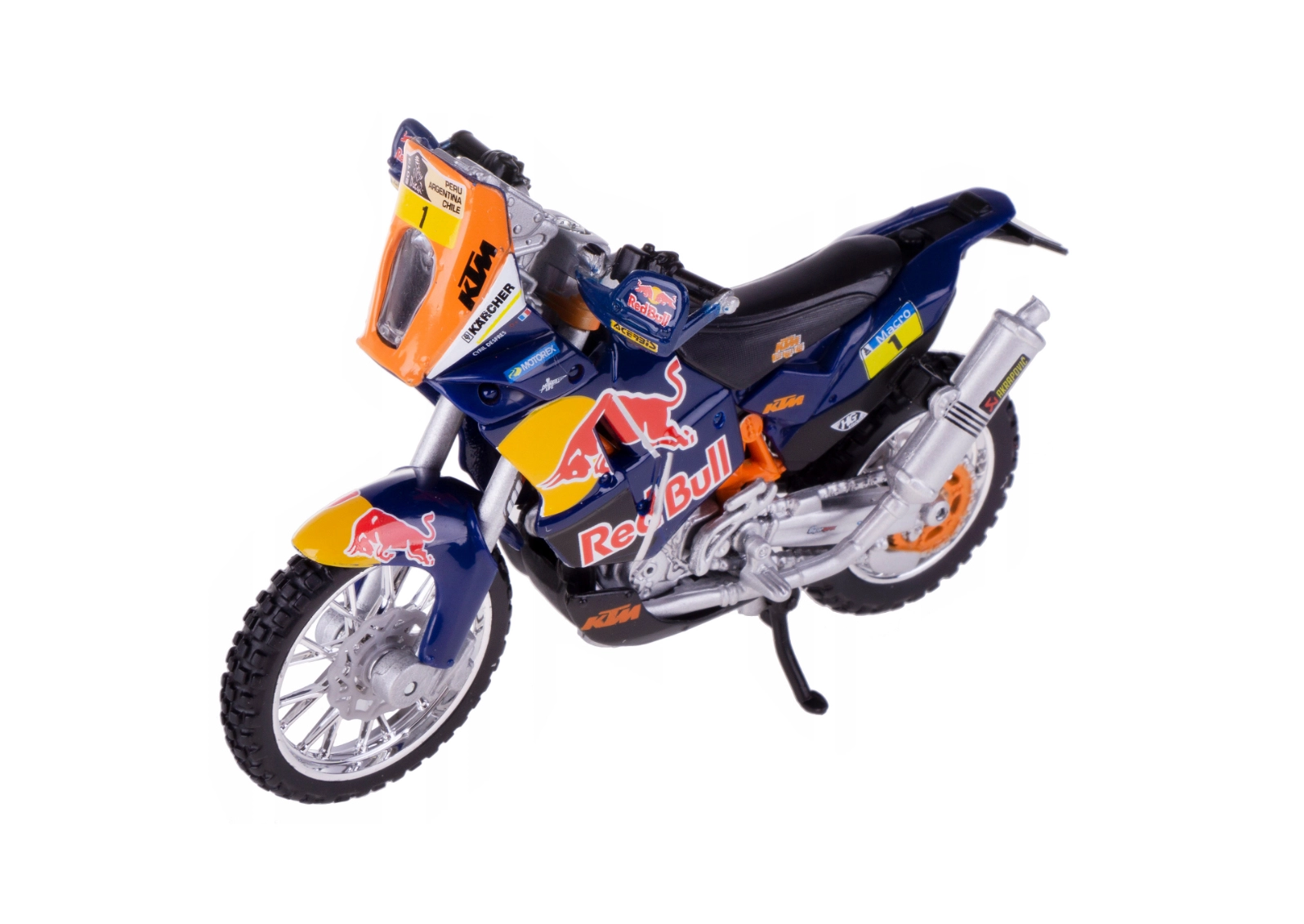 Ontdek de precieze replica van de race-special Red Bull KTM Factory Racing voor de legendarische Dakar Rally. Het model van Bburago op schaal 1:18 valt op door de hoogwaardige metalen body, verfijnde kunststof details en het authentieke teamkleurenschema.