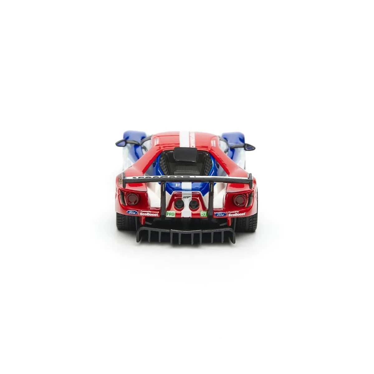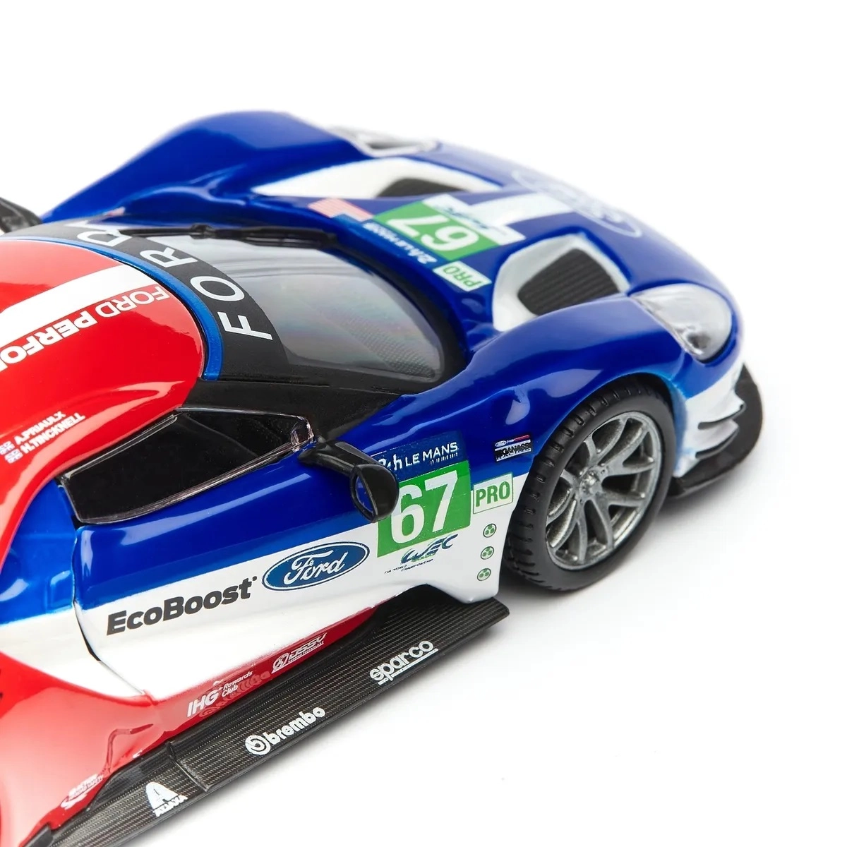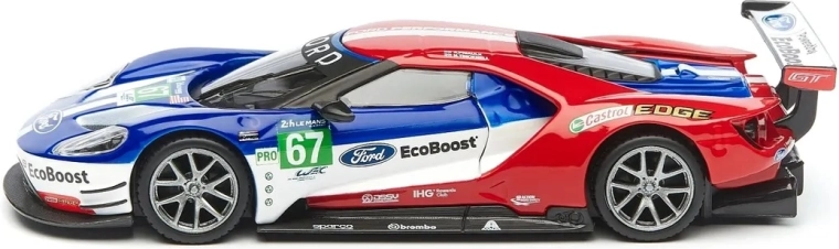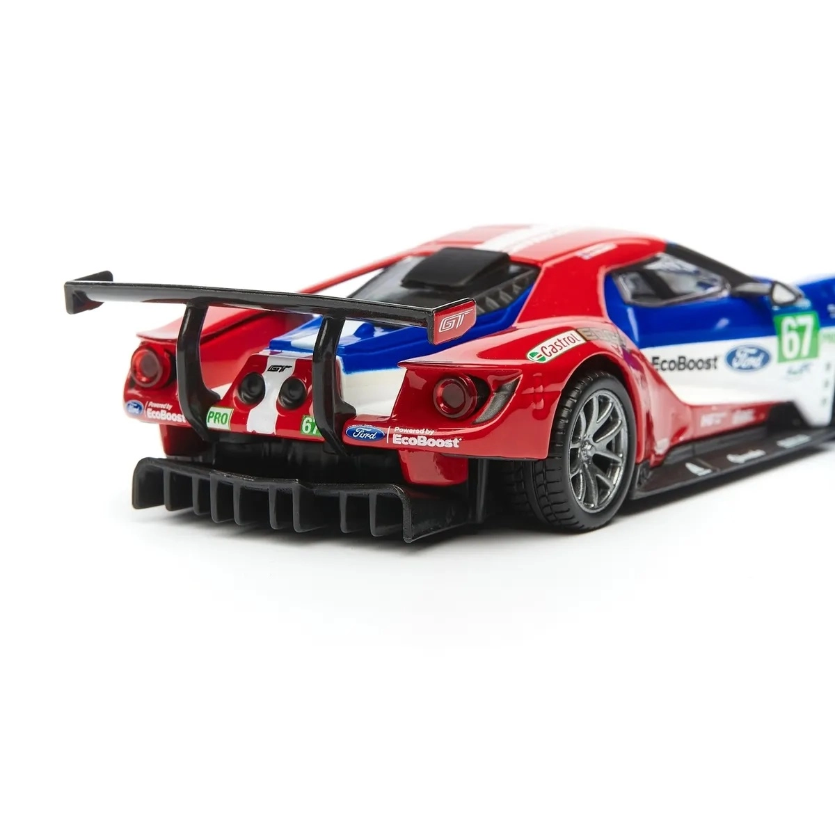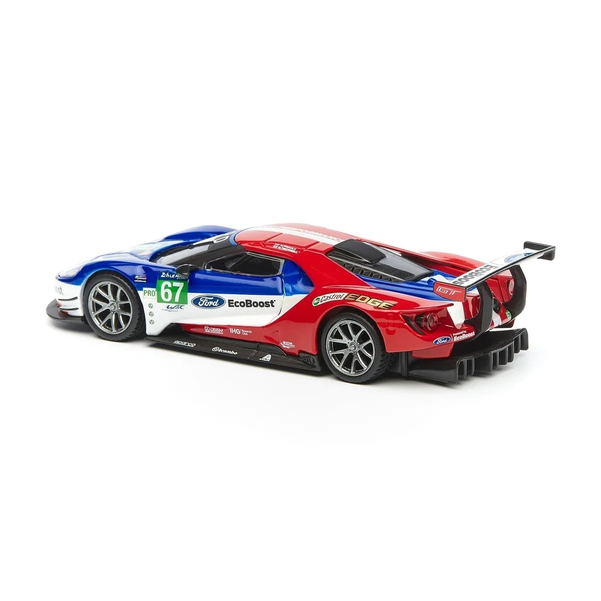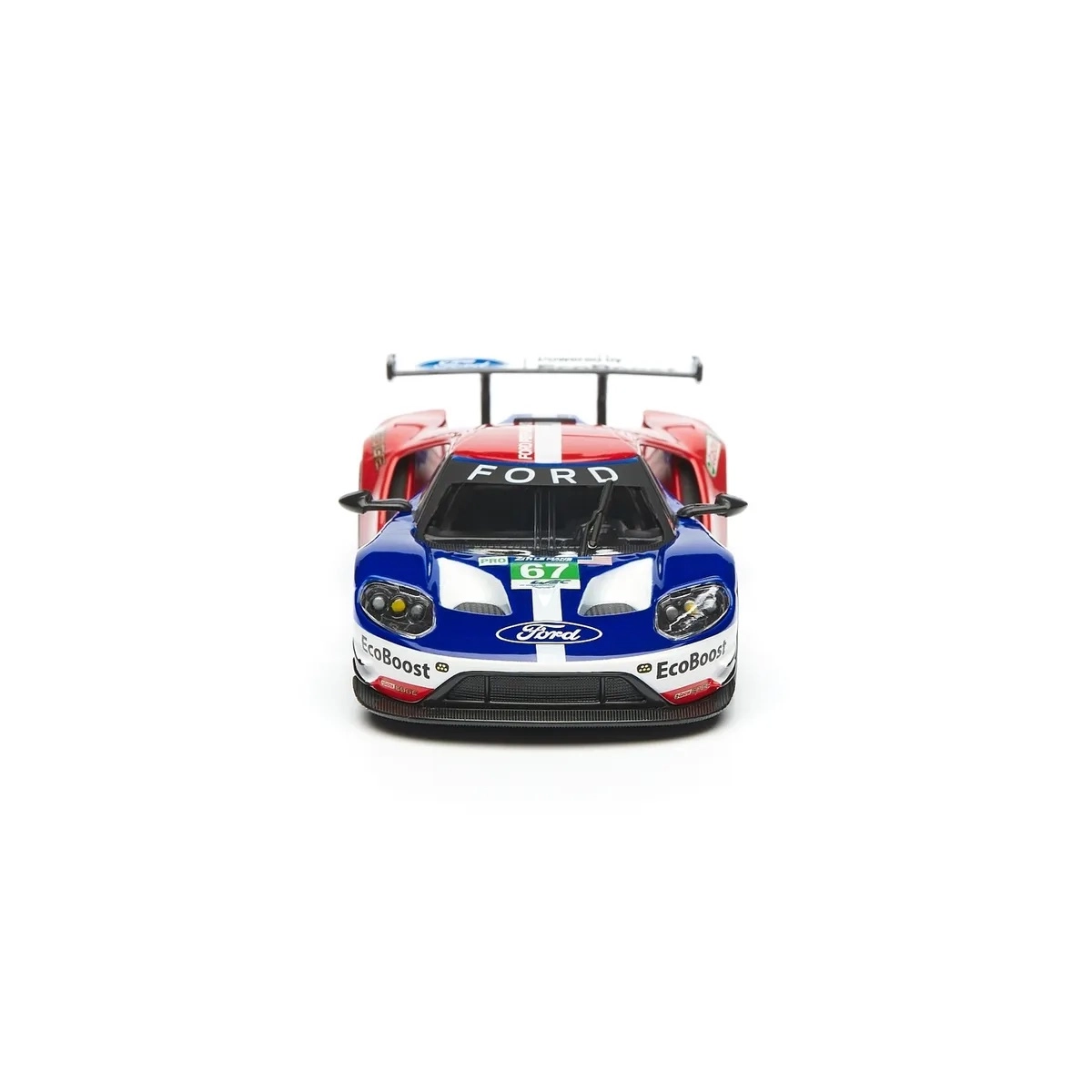 Originele prints van FORD, EcoBoost en startnummer 67 geven het model een racekarakter dat opvalt in de vitrine en op foto’s.
