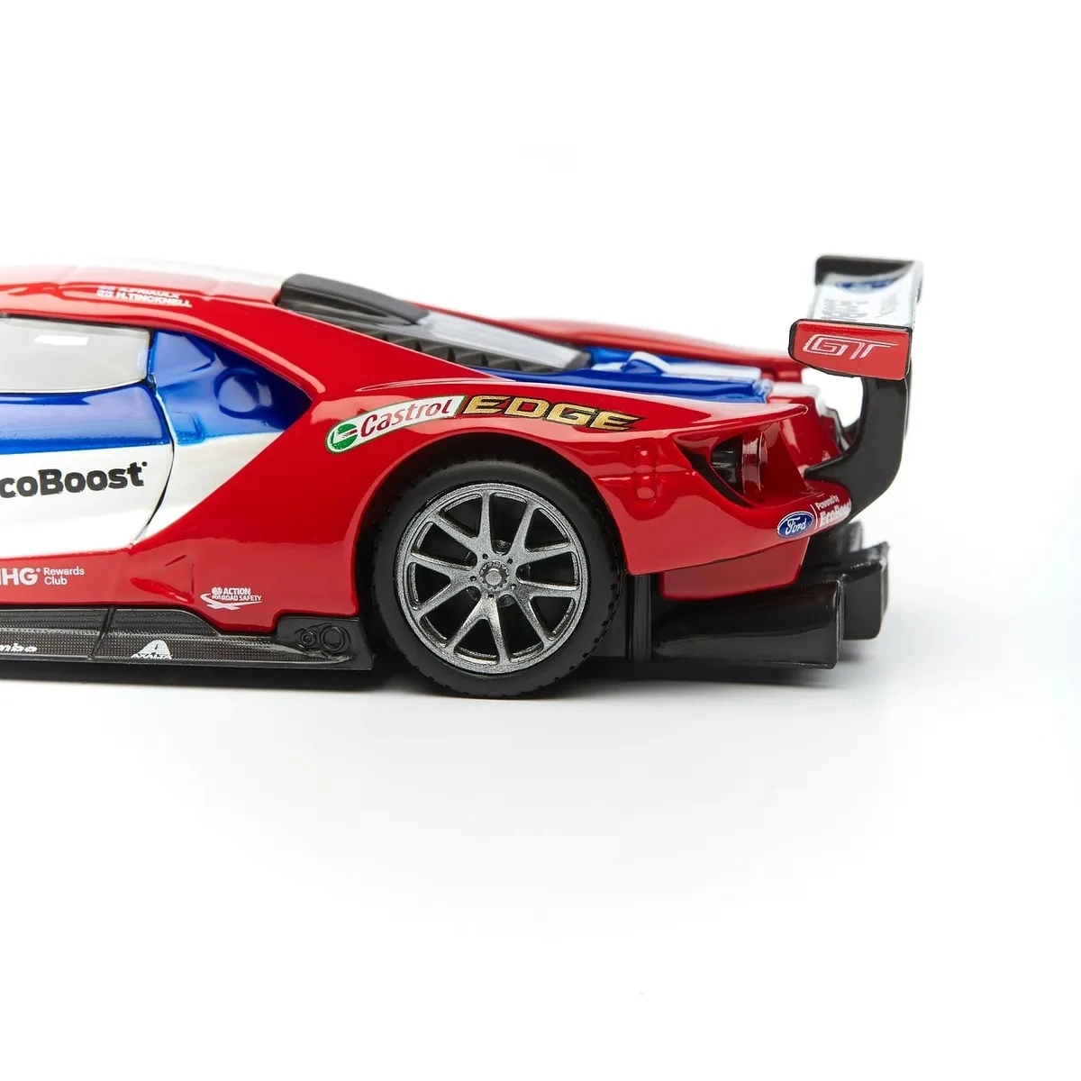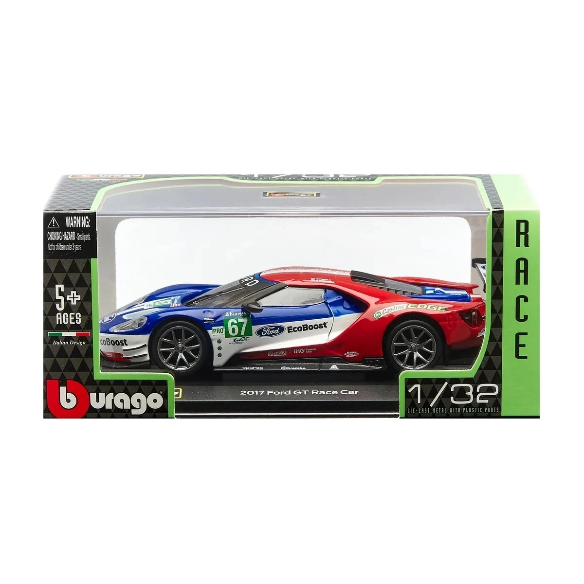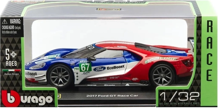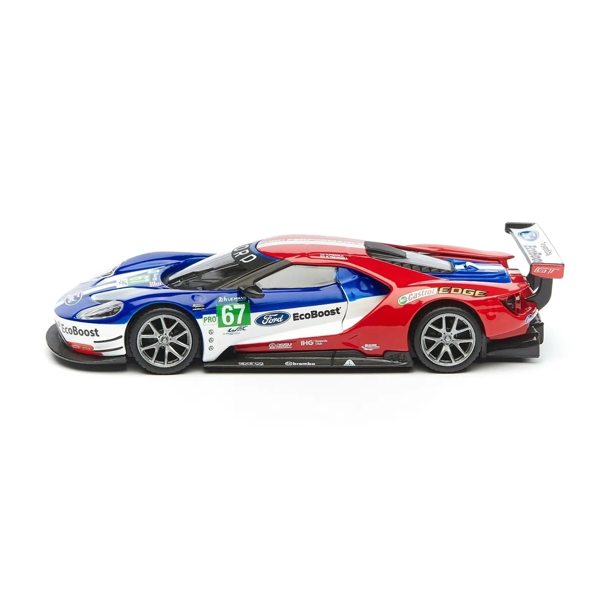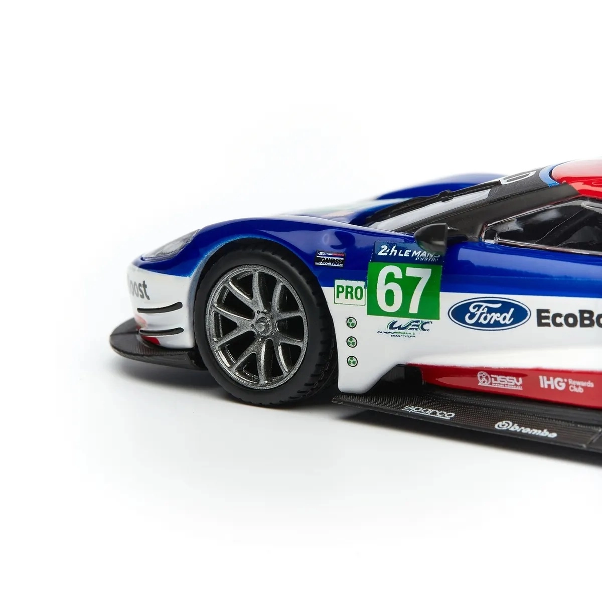 Originele prints van FORD, EcoBoost en startnummer 67 geven het model een racekarakter dat opvalt in de vitrine en op foto’s.