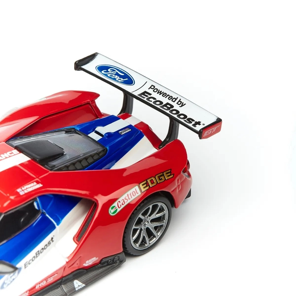 Grote achtervleugel, diffuser en frontsplitter volgen trouw de echte FORD GT-racespecial voor maximale authenticiteit.