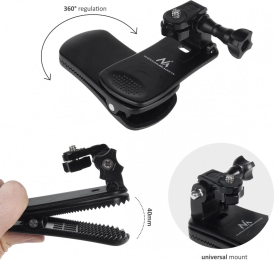 De lichte en compacte clip hecht betrouwbaar aan textiele materialen en biedt snelle montage zonder gereedschap. De robuuste constructie in combinatie met de verstelbare kop zorgt voor stabiele opnames, zelfs tijdens beweging, en laat je de camera precies richten zoals nodig.