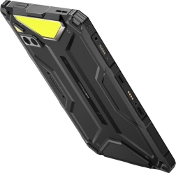 De tablet heeft een robuuste constructie met zwarte en gele accenten, wat zijn duurzaamheid garandeert en hem geschikt maakt voor gebruik buitenshuis.