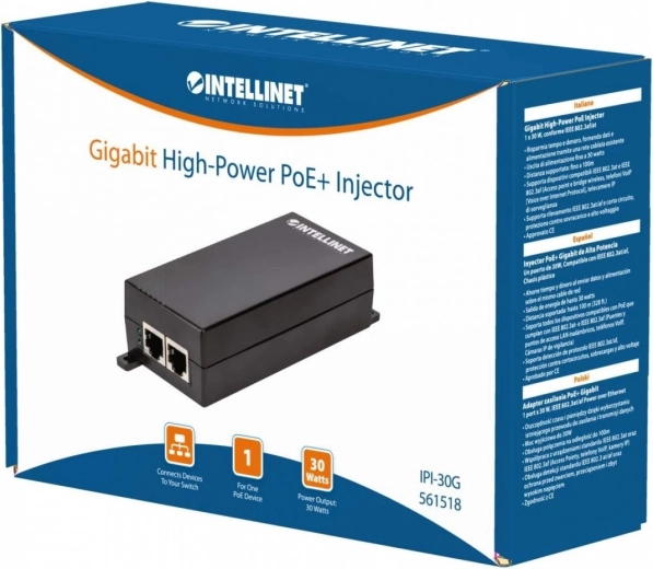 Power over Ethernet (PoE+) injector van Intellinet maakt het mogelijk om apparaten die compatibel zijn met IEEE 802.3af/at standaarden te voeden en aan te sluiten via de bestaande netwerkbekabeling. Met een uitgangsvermogen van maximaal 30W is hij ook ideaal voor energie-intensieve apparaten.