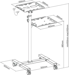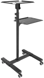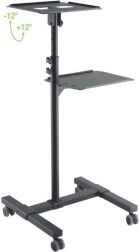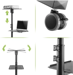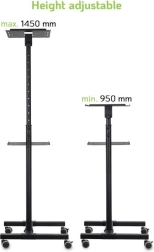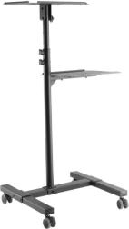 De mobiele metalen tafel is een praktische oplossing voor presentaties, trainingen of conferenties. Dankzij de twee planken biedt het voldoende ruimte voor projector, laptop en andere apparaten. De bovenste plank is verstelbaar in hoogte van 950 tot 1450 mm en maakt een kanteling van 76 mogelijk, wat zorgt voor een optimale projectiehoek.