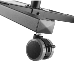 De onderste plank op een hoogte van 685 mm biedt een stabiele plek voor een laptop of andere accessoires. De tafel is uitgerust met vier wielen, waarvan twee met een rem, wat zorgt voor gemakkelijke verplaatsing en stabiliteit tijdens gebruik. Gemaakt van hoogwaardig staal met poedercoating, garandeert het een lange levensduur en duurzaamheid. Montage is eenvoudig en vereist geen speciaal gereedschap dankzij de vleugelschroeven.