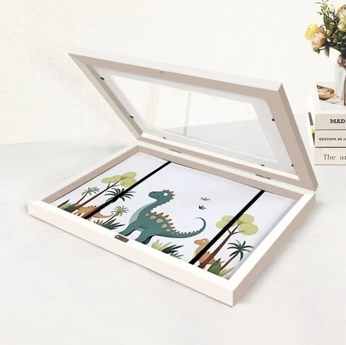 Open de voorkant, plaats een nieuwe tekening en sluit met de magnetische vergrendeling – zonder de lijst van de muur te halen.
