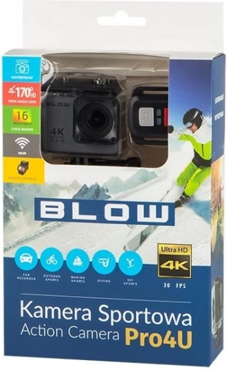 De lichte en robuuste actiecamera BLOW Pro4U legt je belevenissen vast in 4K bij 30 fps, biedt Wi‑Fi-verbinding, een 170° groothoeklens, een overzichtelijk 2" LCD en een waterdichte behuizing tot 30 m. Ondersteunt microSD-kaarten tot 64 GB, opnemen tijdens opladen en kan ook worden gebruikt als webcam.
