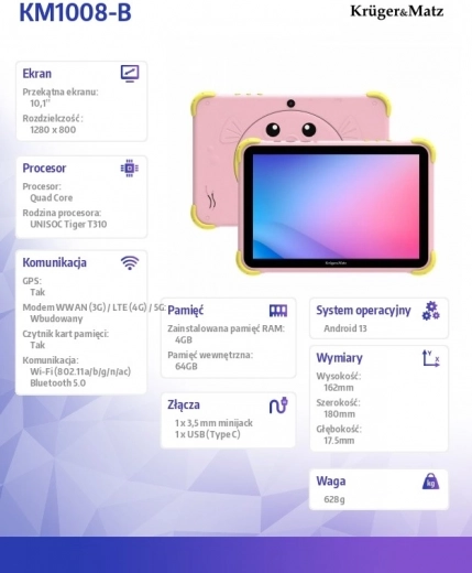 De Krüger&Matz FUN 1008 tablet biedt een unieke ervaring voor kinderen dankzij het roze design en de beschermende elementen. Het display met een resolutie van 1280 x 800 pixels en een beeldverhouding van 16:9 levert heldere en natuurgetrouwe kleuren dankzij IPS-technologie. Ideaal voor kinderen door de brede kijkhoeken.