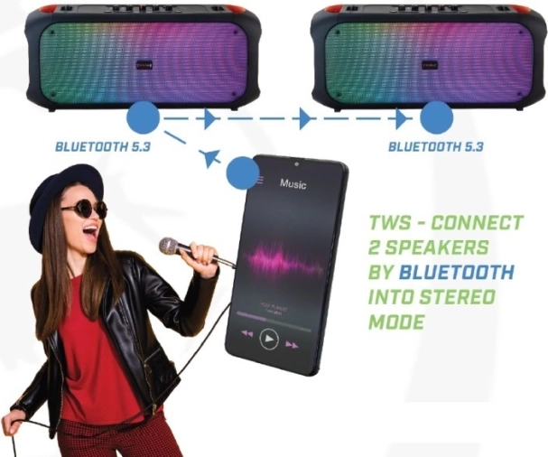 Ondersteuning voor Bluetooth 5.3 garandeert een stabiele verbinding zonder vertraging. De TWS-functie maakt koppeling van twee luidsprekers mogelijk voor surroundgeluid.