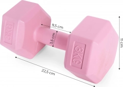 Ontdek veelzijdige dumbbells waarmee je armen, rug, buik, benen en billen traint. Het gewicht van 3 kg per stuk is perfect voor kracht, conditie en calorieverbranding. De zeshoekige uiteinden voorkomen rollen en garanderen stabiliteit tijdens rustpauzes en steunende oefeningen.