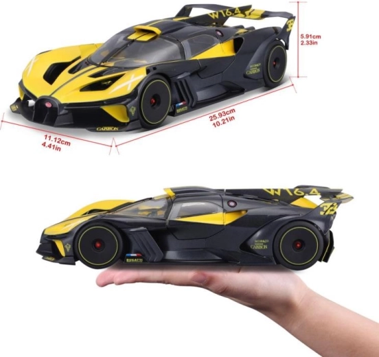 Ontdek de getrouwe replica van de revolutionaire supersportwagen BUGATTI BOLIDE in een precieze uitvoering. De die-cast metalen carrosserie, realistische proporties en contrasterende geel-zwarte lak benadrukken de agressieve aerodynamische lijnen, waardoor het model in elke collectie uitblinkt.