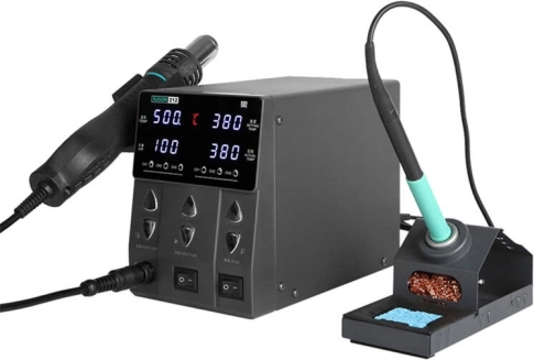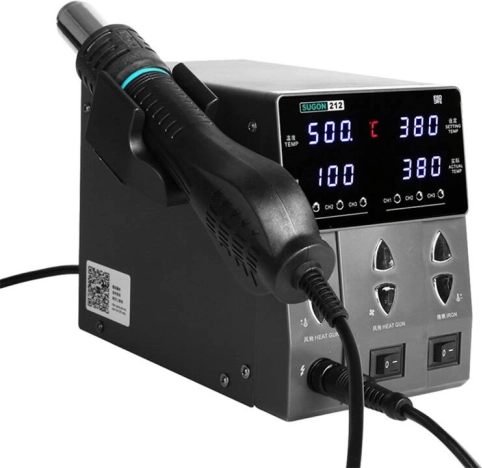 Sugon 212 combineert een heteluchtstation en een T12‑soldeerbout, waardoor het een complete tool is voor reparatie en assemblage van elektronica. Het maakt niet alleen nauwkeurig solderen mogelijk, maar ook eenvoudig desolderen en monteren van SMD‑onderdelen. Drie programmeerbare knoppen laten u de optimale instellingen voor temperatuur en lucht opslaan.