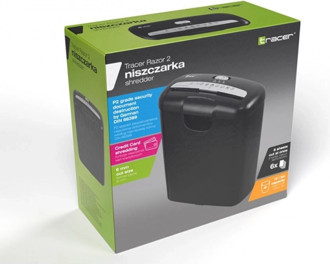 De TRACER Razor 2 biedt betrouwbare en veilige vernietiging van alledaagse kantoorstukken in het comfort van thuis. De brede invoeropening en de capaciteit tot 6 vellen versnellen het werk aanzienlijk, terwijl snijden in stroken van 6 mm de bescherming van gevoelige informatie op niveau P2 (DIN 66399) waarborgt. Dankzij de mogelijkheid om betaalkaarten te vernietigen, beschermt u ook persoonlijke gegevens buiten papieren documenten.