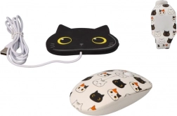 De transparante mok met kattenmotief en de stijlvolle zwarte plaat maken elke werkplek gezelliger.