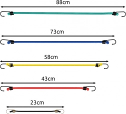 Deze universele bagageriemen zijn niet alleen handig voor auto's, maar ook voor kamperen of survivalactiviteiten. Ze behouden hun elasticiteit zelfs na herhaaldelijk uitrekken en zijn eenvoudig in gebruik, aangezien elke riem is voorzien van een stevige metalen haak voor snelle bevestiging.
