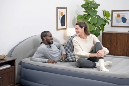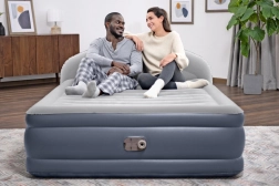 Het dubbelwandige opblaasbare matras BESTWAY Tritech LoungeLux biedt comfortabele slaap voor 2 personen, een verhoogde hoogte voor gemakkelijk opstaan en een geïntegreerde elektrische pomp voor snel opblazen en leeg laten lopen. Het aangename suède (velours) oppervlak is eenvoudig te reinigen, het ingebouwde hoofdeinde dient als kussen en de beschermende rand rondom voorkomt wegglijden tijdens de slaap. Inclusief een nylontas voor makkelijk dragen en opbergen.