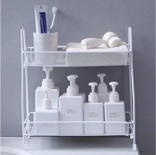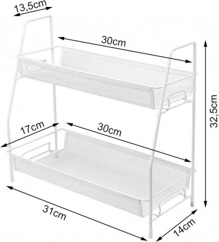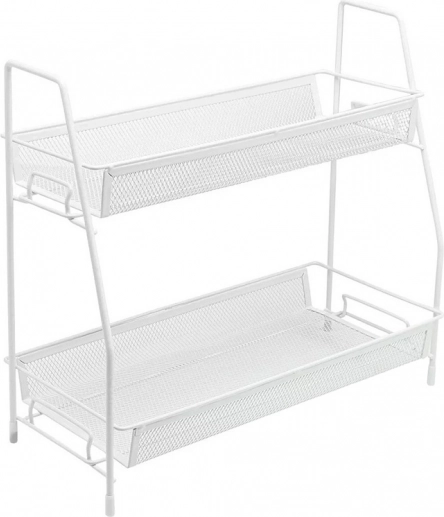 Deze universele tweelaagse standaard in elegant wit bespaart ruimte en houdt alles overzichtelijk binnen handbereik. Metalen gaasplanken zorgen voor luchtcirculatie en de verhoogde randen voorkomen dat voorwerpen eraf vallen. Het minimalistische A-frame past in moderne interieurs en geeft het werkblad een strakke, opgeruimde uitstraling.