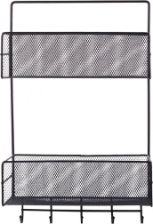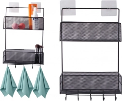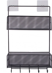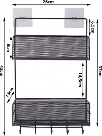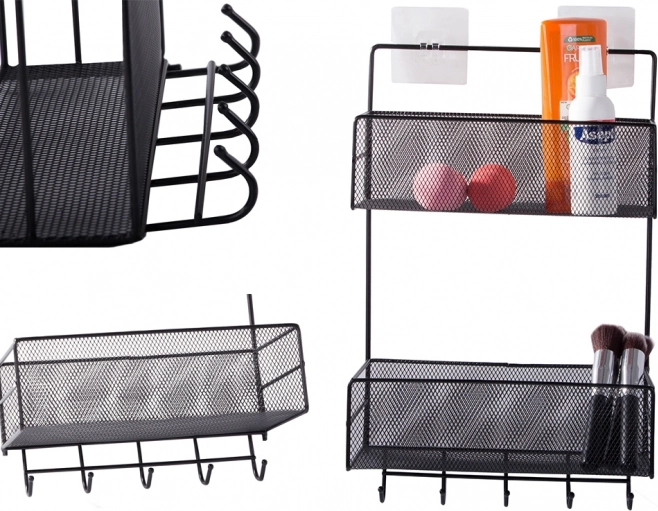 Deze multifunctionele wandorganizer van gelakt metaal is de ideale oplossing voor overzichtelijke en elegante opslag van alledaagse benodigdheden. Twee geventileerde mandplanken bieden plaats aan cosmetica, schoonmaakmiddelen, kruiden en kleine accessoires, terwijl de onderste haken handdoeken, theedoeken of sleutels altijd binnen handbereik houden. Dankzij de montage zonder boren bevestigt u hem eenvoudig op een glad oppervlak.