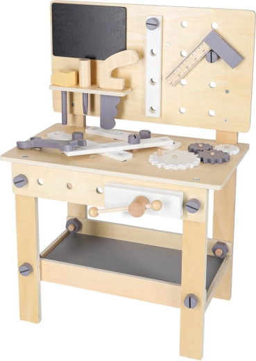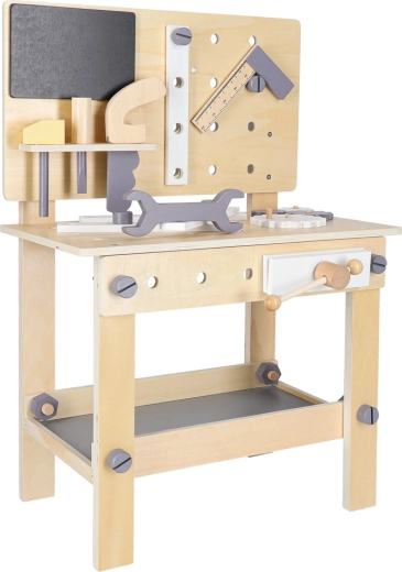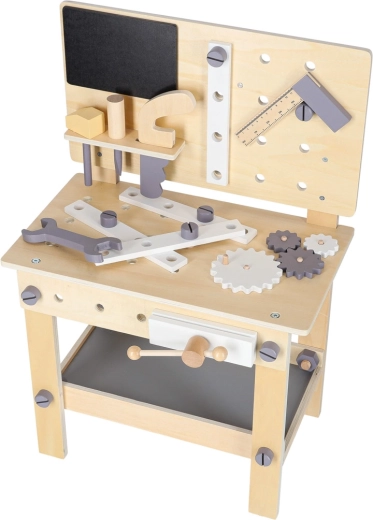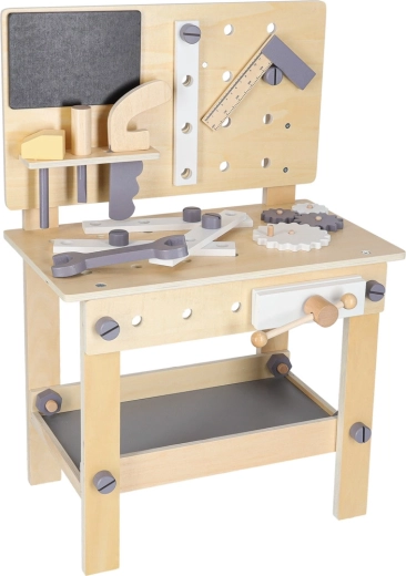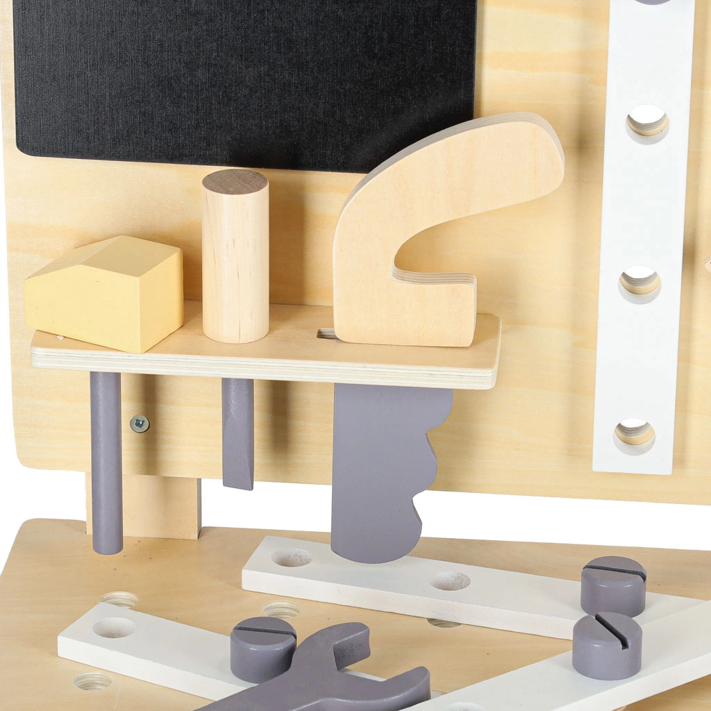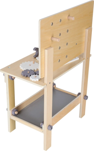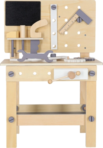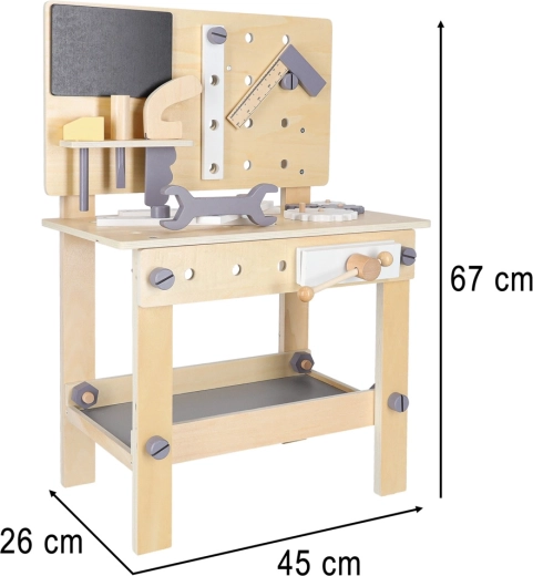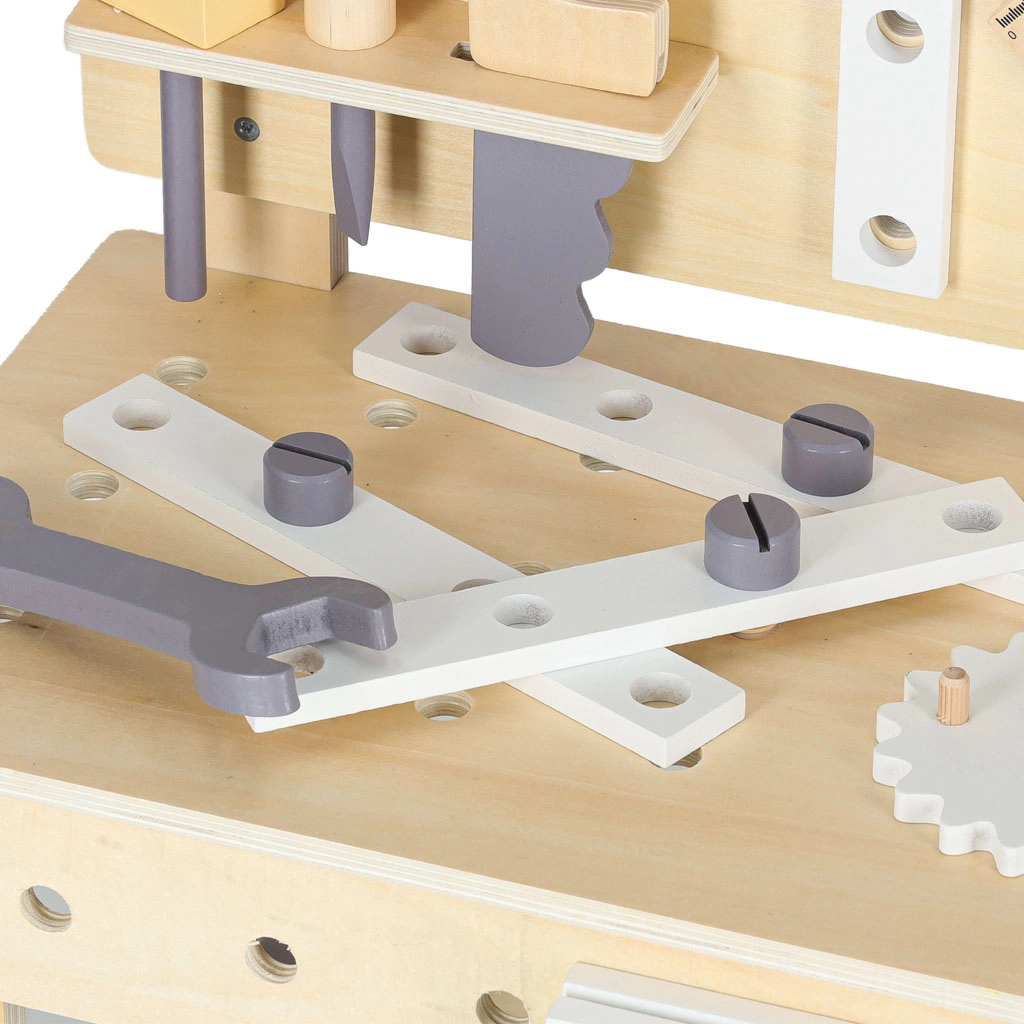 Stijlvolle houten werkbank voor kleine doe-het-zelvers die urenlang creatief spel en leren biedt. Inclusief hamer, schroevendraaier, steeksleutel, zaag, meetlat, schroeven, moeren, tandwielen en een functionele bankschroef. De stevige constructie, opbergplank en geperforeerde wand ondersteunen orde, fijne motoriek en logisch denken.