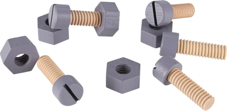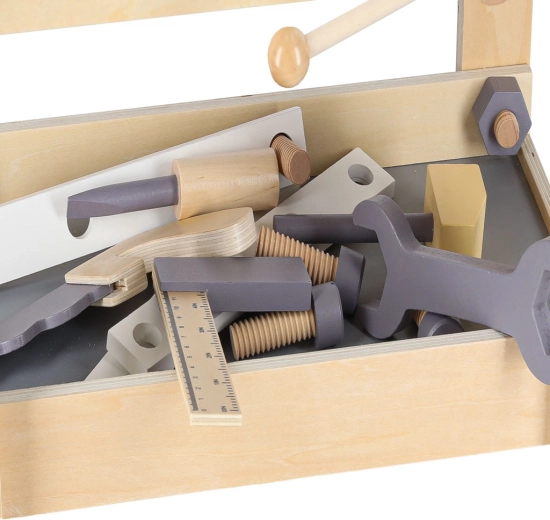 Zaag, hamer, schroevendraaier, verstelbare moersleutel, meetlat, schroeven en moeren – alles wat nodig is voor creatieve montage en het ontwikkelen van de fijne motoriek.