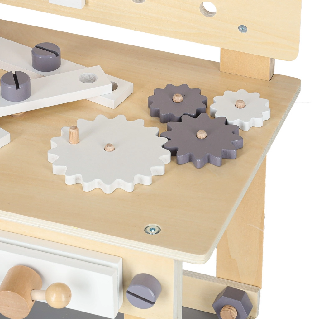 De houten werkbank is ideaal voor kinderen die van repareren en bouwen houden. Met de uitgebreide set gereedschap en accessoires proberen ze schroeven, timmeren, meten en het draaien van tandwielen uit. De stabiele uitvoering in neutrale kleuren past perfect in de kinderkamer.