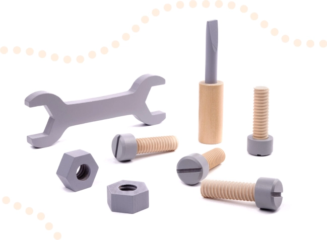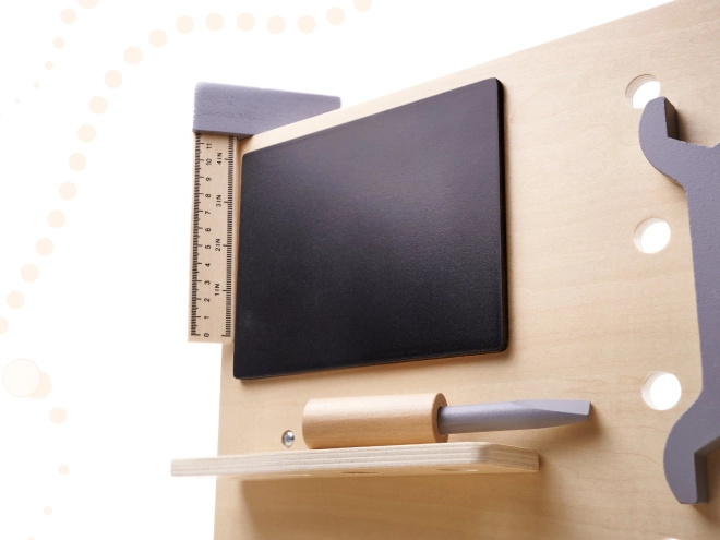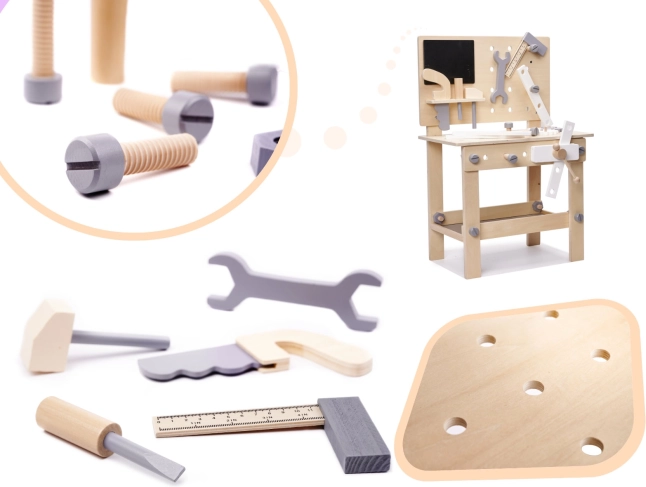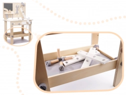 Het speelgoed imiteert echte gereedschappen zoals een schroevendraaier, hamer en Engelse sleutel, ideaal voor de ontwikkeling van de fijne motoriek en de verbeelding van kinderen.