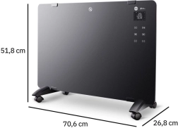 De elegante elektrische paneelverwarming ELDOM met gehard glas combineert convectie en straling voor snelle en zuinige warmte in ruimtes tot 20 m². Biedt afstandsbediening, app via Wi‑Fi, touchpanel, 2 vermogensniveaus (1300–1500 W), stille werking en een rijke uitrusting inclusief weektimer en Open-raam-detectie.