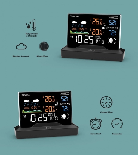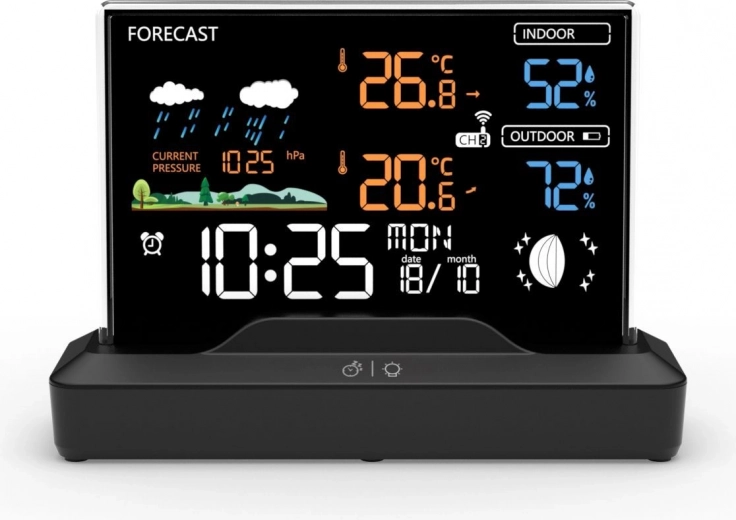 Dankzij de draadloze sensor met een bereik tot 30 m ontvang je actuele temperatuur- en vochtigheidsgegevens van binnen en buiten. De barometer en de ingebouwde weersvoorspelling voor 12–24 uur maken dagplanning eenvoudiger. Verder aanwezig: wekker met snooze, kalender en weergave van de maanfasen.