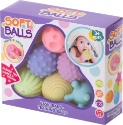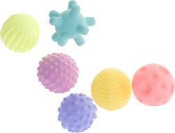 De set bevat zes ballen met verschillende structuren: kleine en grote uitstulpingen, holtes, streepjes en egelvormige stekels. Leer coördinatie, kleur- en vormherkenning, en biedt een ontspannende massage die kalmeert en het kind voorbereid op slaap.
