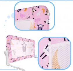 De installatie is snel en zonder boren – de poten schuif je eenvoudig onder het matras. Het zachte roze ontwerp met schapenmotief past in de meeste interieurs en maakt de kinderkamer extra gezellig. Het hek is ideaal voor de overgang van ledikant naar groot bed en helpt ouders en kinderen rustiger en veiliger te slapen.
