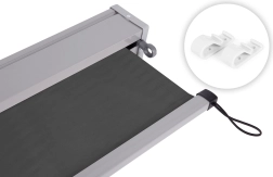 Onderste bevestiging:Dankzij de meegeleverde componenten en elastische banden aan de onderrand van de zonwering kunt u de uiteinden van de uitgerolde zonwering aan de muur vastzetten. Deze functie zorgt voor stabiliteit, vooral bij winderig weer.