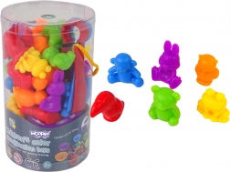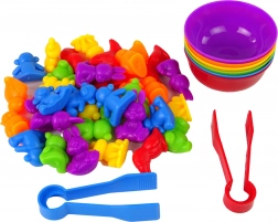 Deze kleurrijke Montessori-set biedt een eenvoudige maar zeer effectieve leermethode. Kinderen strooien de figuurtjes op tafel en plaatsen ze met het tangetje in de schaaltjes op kleur, waarmee ze oog-handcoördinatie, concentratie en logisch denken ontwikkelen. De rubberen figuurtjes voelen prettig aan en zijn veilig voor kleine kinderhanden.