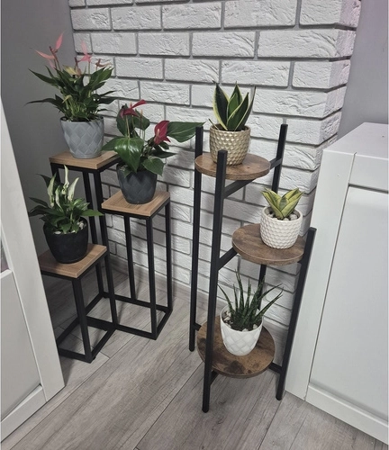 Staande plantenstandaard Loft 3-niveaus is een moderne en stijlvolle oplossing voor uw huis of tuin. Dankzij de stabiele constructie van metaal en MDF biedt deze standaard een veilige ondersteuning voor uw planten.