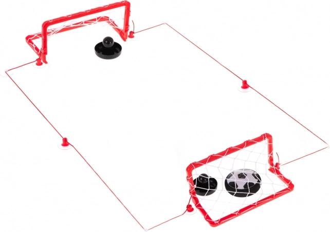 Twee goals, pushers en een koord om het speelveld af te bakenen toveren elke tafel om tot een arena voor snelle airhockey-/voetbalwedstrijden.