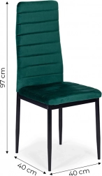 De stoelen hebben een modern design dat de groene bekleding combineert met zwarte metalen poten, een ideale keuze voor hedendaagse interieurs.