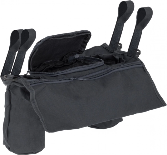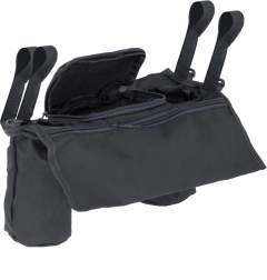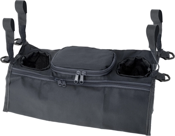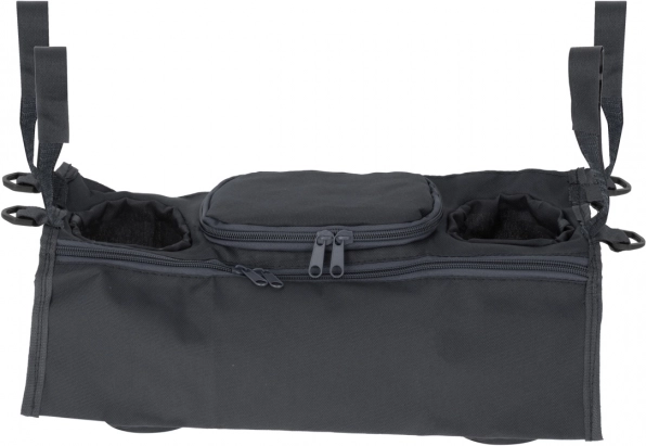 Eenvoudige bevestiging met klittenband aan de zijkanten houdt de organizer stabiel aan de handgreep. Twee ruime vakken voor drankjes met een diameter van circa 7 cm en extra vakken voor kleine spullen bieden voldoende ruimte voor alles wat je bij de hand wilt hebben.